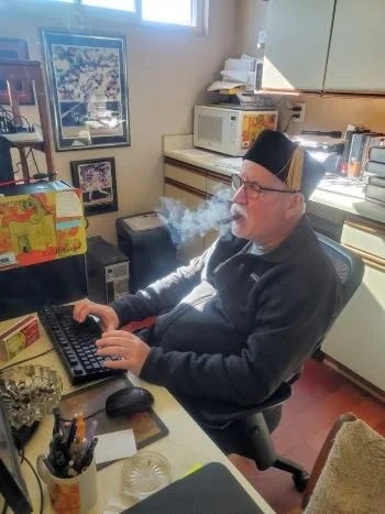 The script writer—in his Turkish smoking hat—hard at work on the next episode